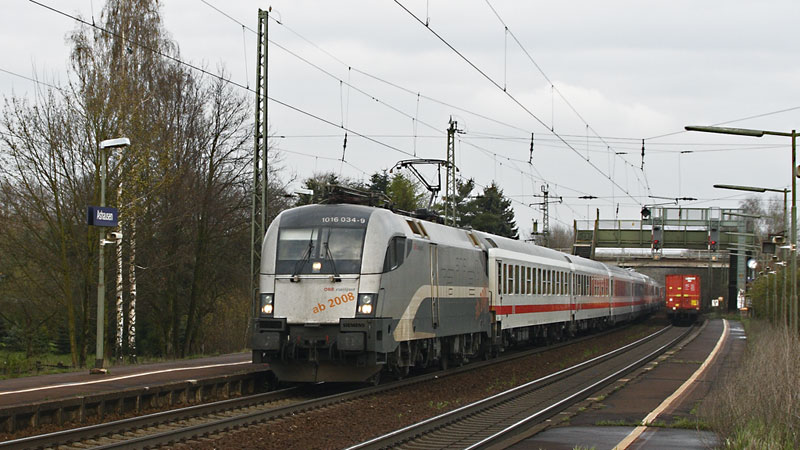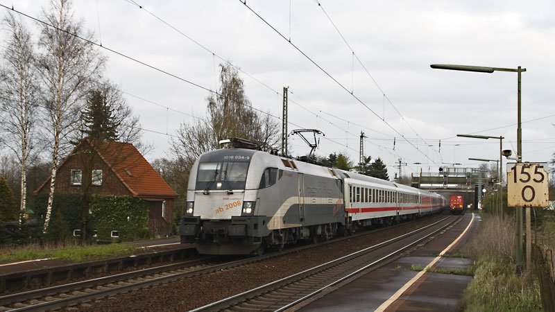 | Noch in der grauen railjet-Versuchslackierung war die 1016 034-9 am IC 2082 Königssee auf dem Weg nach Hamburg. Ashausen, 13. April 2008 | ||