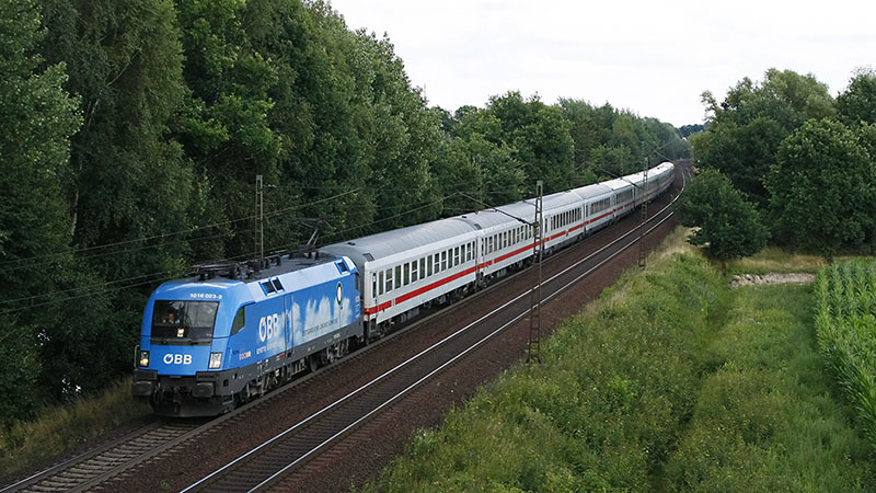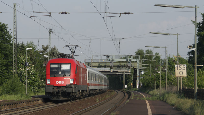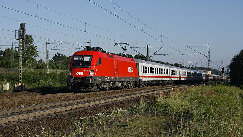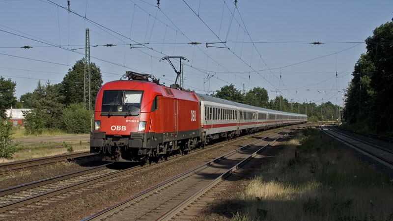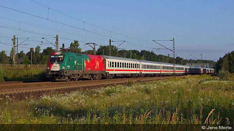 | Wenige Minuten später nach dem EN 490 kam der zweite ÖBB-Stier-Starzug – der IC 2083 Königssee. Diesmal hatte die rote 1016 018-2 die Ehre. Meckelfeld, 24. Juli 2008 | ||