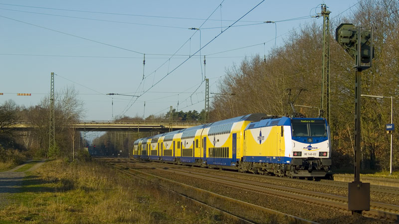 ME 146-08 schiebt ihren metronom gen Hamburg und passiert gleich die achtgleisige