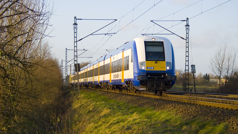ein schicker Zug der Nord-Ostsee-Bahn – der MEX eilt von der Dispolok-ER