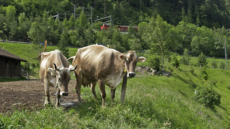 | Die lieben Schweizer Alpenkühe leisteten uns Gesellschaft – im Hintergrund ist die zweite Ebene der Strecke zu sehen. Wassen, 08. Juni 2007 | ||
