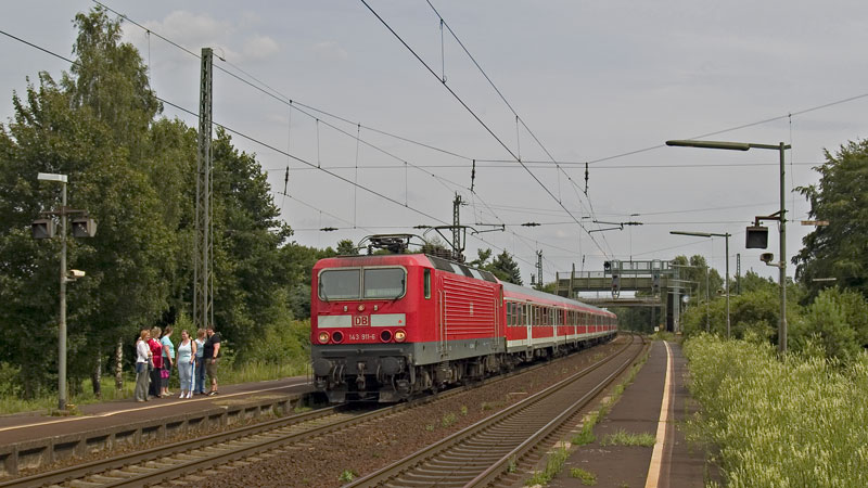 | Die Frauen sind los! Diese Frauengruppe feierte "Junggesellenabschied" und wartete auf die RB nach Hamburg Harburg mit der 143 911-6, der auch noch 20 Min. Verspätung hatte. Ashausen, 14. Juli 2007 | ||