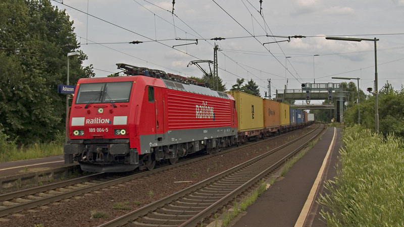 | Die imposante vierachsige Mehrsystembaureihe 189, hier in Form der 189 004-5, mit einem schweren Containerzug nach Hamburg Waltershof. Ashausen, 14. Juli 2007 | ||