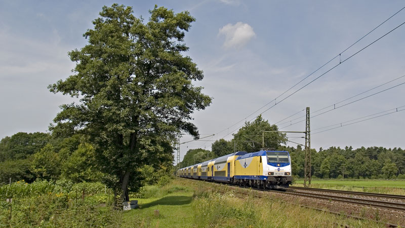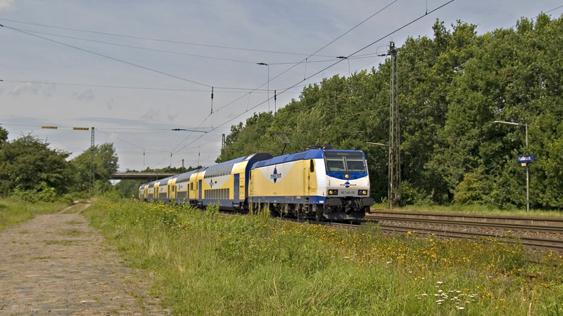 | Die einzige ME 146.1, die ME 146-06, die hauptsächlich zwischen Uelzen und Göttingen eingesetzt wird – durfte mal nach Hamburg durchlaufen und so fuhr sie soeben zurück nach Göttingen. Radbruch, 14. Juli 2007 | ||