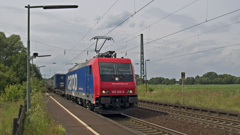 einem KLV-Zug gen Süden durchjagte die 482 048-6 der SBB Cargo den