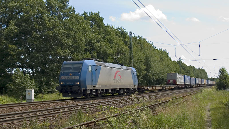 | 185 512-1 der TX Logistik schleppte einen langen Zug des kombinierten Ladungverkehrs in Richtung Hamburg, als sie Radbruch passierte. 14. Juli 2007 | ||