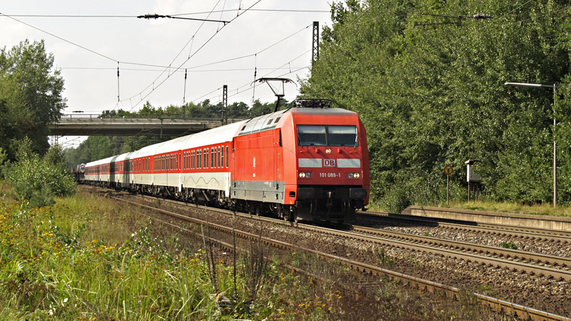 kein IC hinter der 101 089-1, sondern der Autozug 13391 nach Rijeka in Kroatien. Radbruch, 24. August 2007 |
