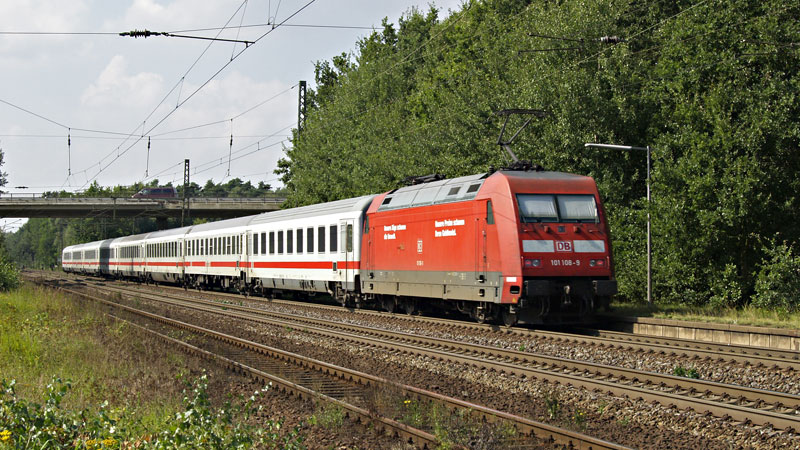 | Zwischendrin düsen die wieselflinken 101er mit ihren IC's durch Radbruch, so auch hier die 101 108-9 auf dem Weg nach Hamburg. 24. August 2007 | ||