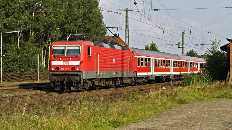 | Da in der Zwischenzeit keine Güterzüge und so fuhren, wurde die nächste RB nach Lüneburg aufs Chip gebannt – diesmal mit der 143 348-1. Radbruch, 24. August 2007 | ||
