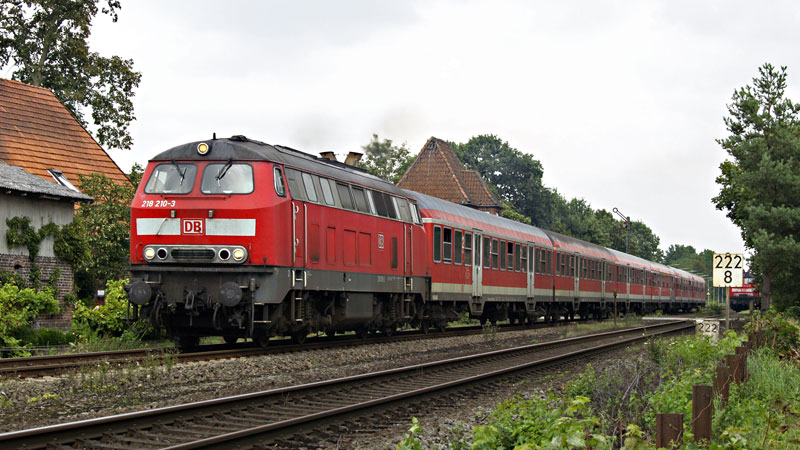 | In Himmelpforten finden die stündlichen Zugkreuzungen statt – da die baufällige Brücke über die Oste eingleisig ist. Die 218 210-3 fährt mit ihrem RE nach Cuxhaven aus. 25. August 2007 | ||