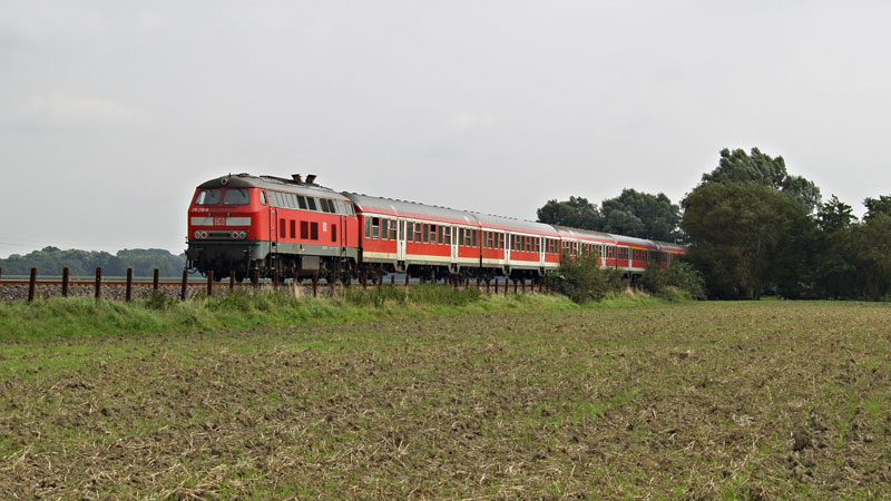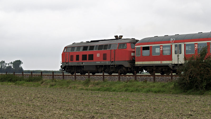 | Bei Altenbruch, einem "Vorort" von Cuxhaven wurde die Richtung Cuxhaven fahrende 218 218-6 vor ihrem RE aus Hamburg abgelichtet. 25. August 2007 | ||