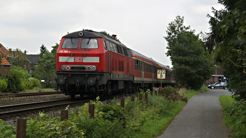 | Der RE von Cuxhaven nach Hamburg mit der schiebenden Lübecker 218 386-1 bei der Einfahrt in den Bahnhof von Himmelpforten. 25. August 2007 | ||