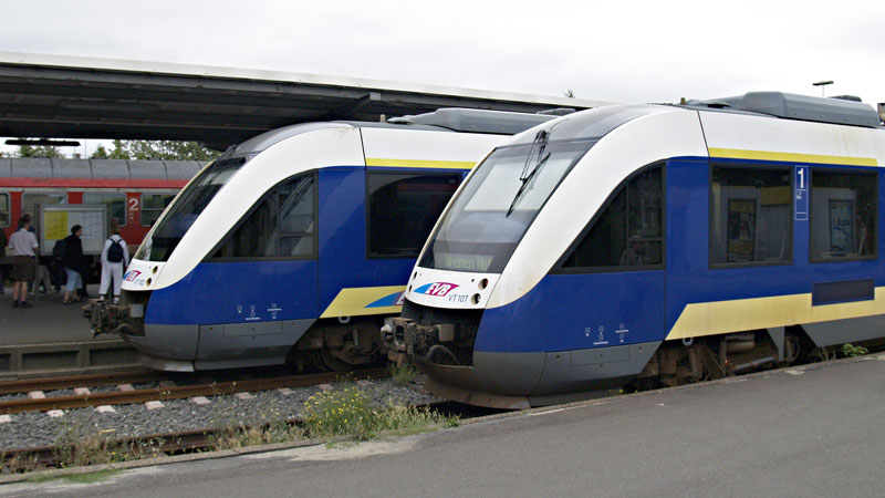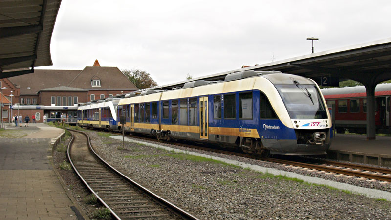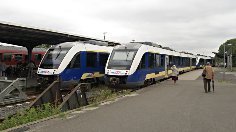 | Auf der Strecke Cuxhaven - Bremen fährt die EVB "Nordseebahn" mit modernen, aber nicht immer sauberen LINT-Triebwagen. Die Triebzüge 102 und 105 am Kopfende des Bahnhofes. Cuxhaven, 25. August 2007 | ||