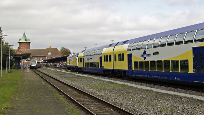 | Die Zukunft auf der Unterelbebahn sieht sehr gut aus – wenn man diese hochmoderne Doppelstockgarnitur hinter der modernen Diesellok betrachtet. Cuxhaven, 25. August 2007 | ||