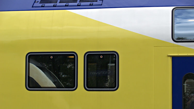 Spiegelung des EVB-Triebwagens und des Bahnhofsschildes am neuen Doppelstockwagen.