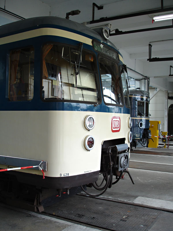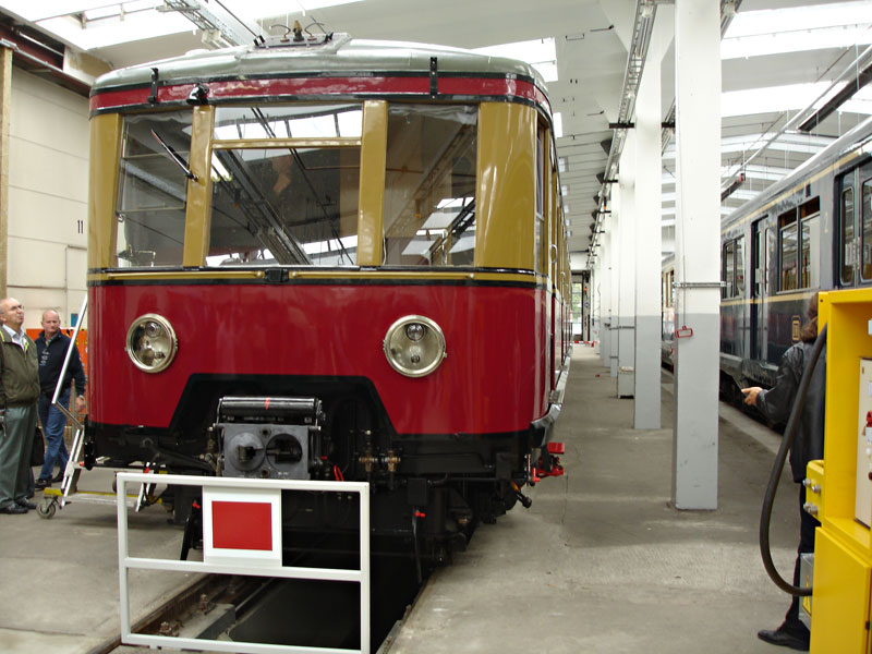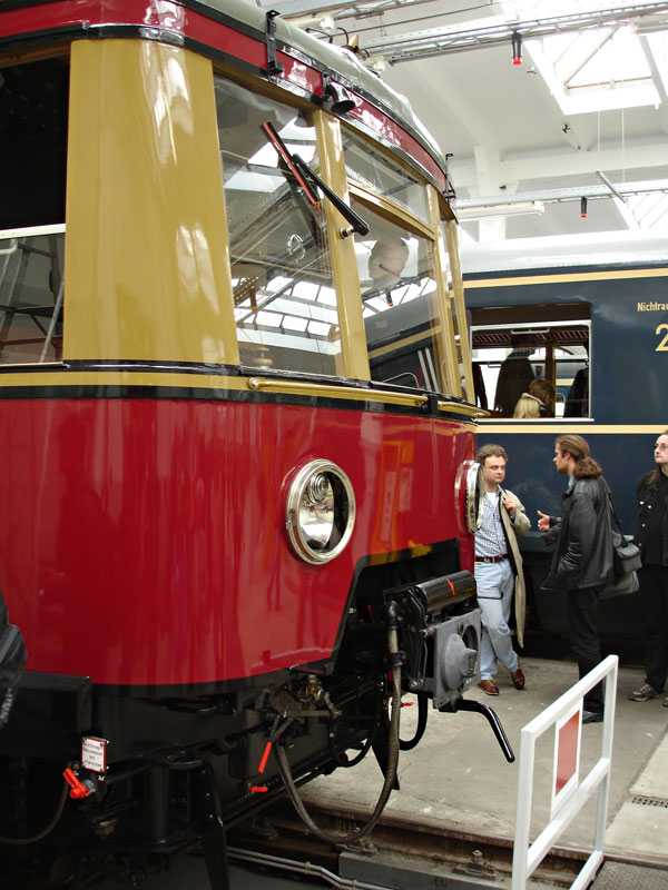 | Zurück in die Halle – der historische Berliner Triebzug der Bauart "Olympia-Zug" – der Name sagt es schon: die ersten kamen zu den Olympischen Spielen von 1936. GSB Hamburg Ohlsdorf, 2. September 2007 | ||