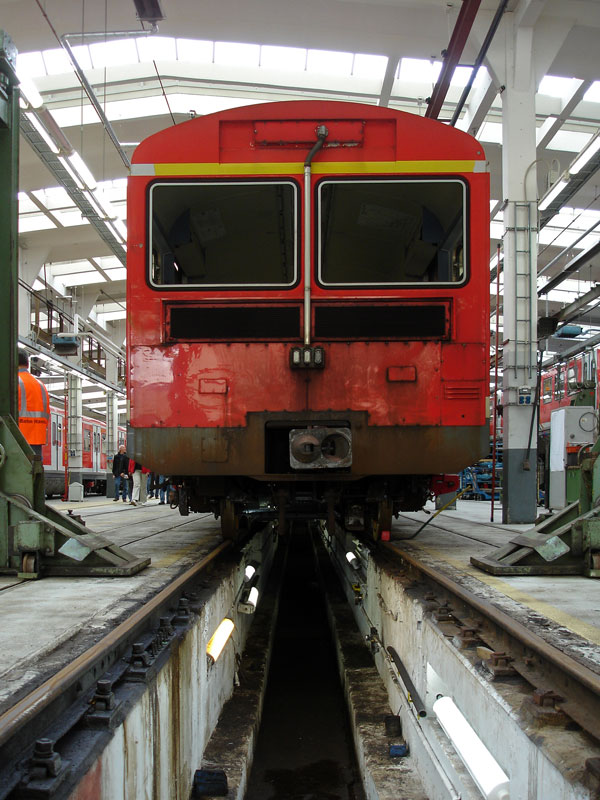 seinen Drehgestellen getrennt schwebt der 472 259 über dem vollautomatischen
