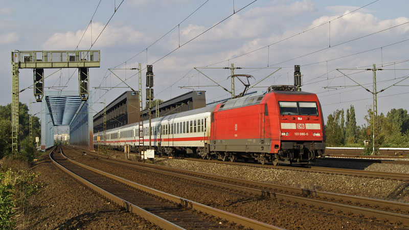 101 080-0 eilte mit ihrem InterCity gen Süden bzw. Westen. Hamburg Süderelbbrücken, 19. September 2007 |