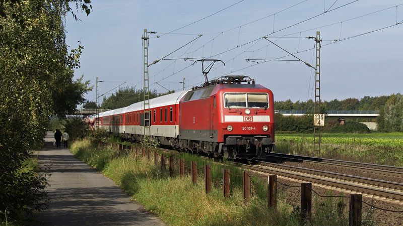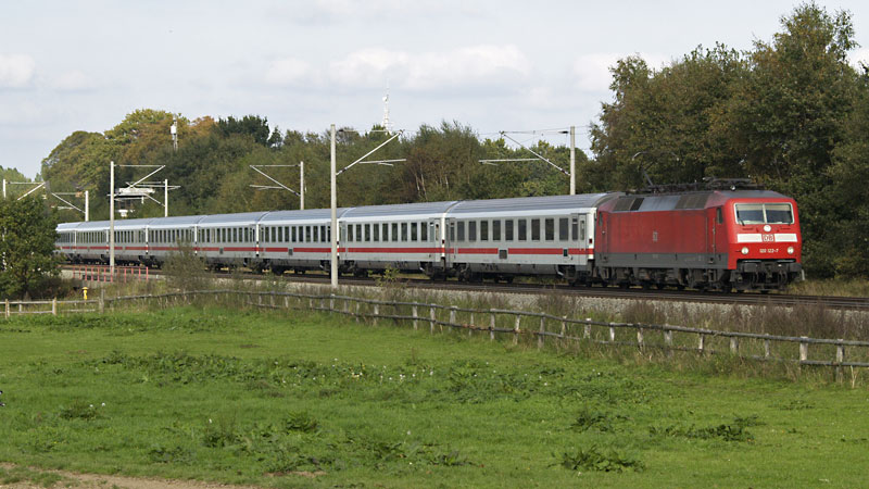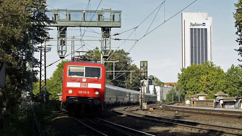 einem InterCity kam die 120 132-6 von Hamburg Dammtor – im Hintergrund