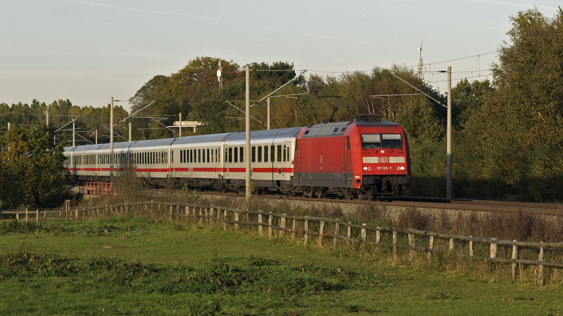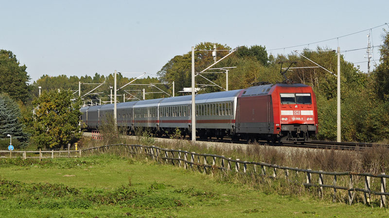 | Mit einem weiteren IC ins Ruhrgebiet war die 101 128-7 beschäftigt – die IC-Linie 1 fährt Sonntag Nachmittags aufgrund der hohen Nachfrage fast im Halbstundentakt! Hittfeld, 14. Oktober 2007 | ||