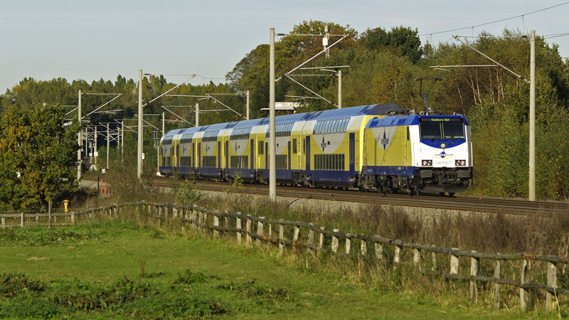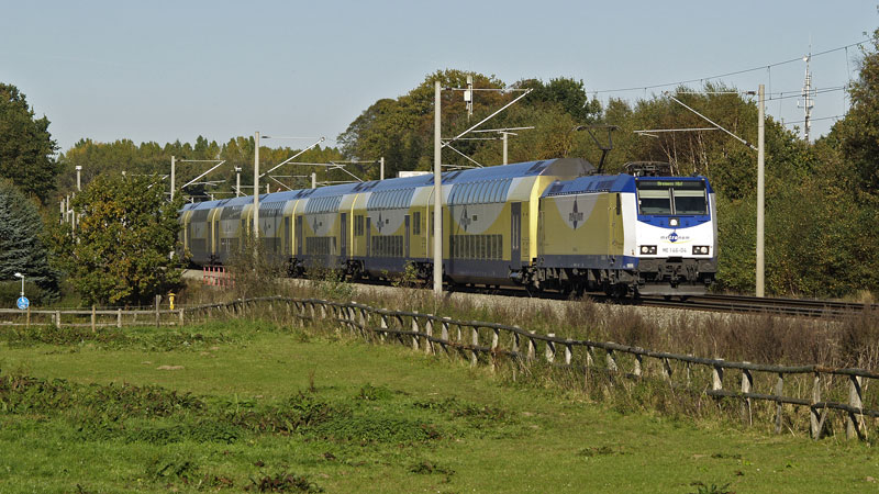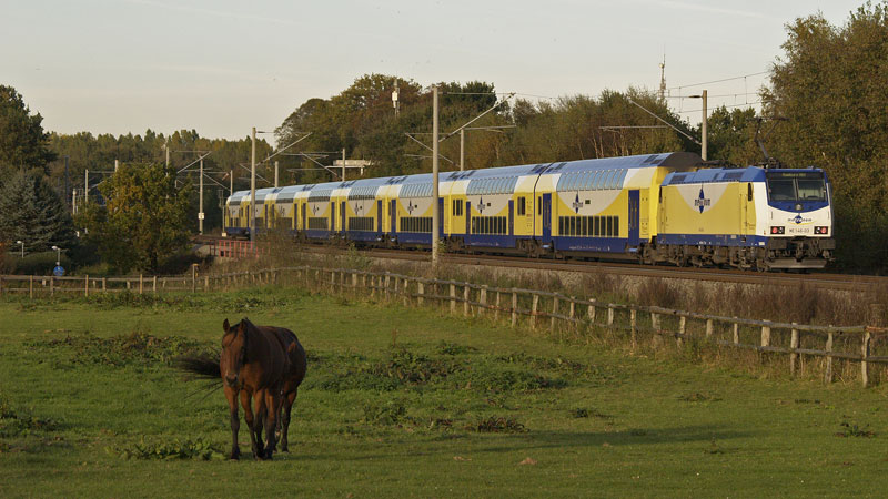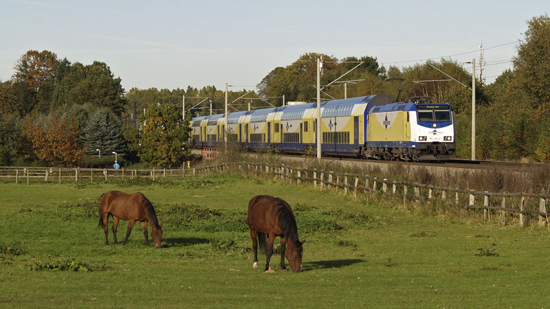 | Die Pferde ließen sich diesmal nicht aus der Ruhe bringen, als die ME 146-01 mit ihren achtteiligen metronom nach Bremen vorbeifuhr. Hittfeld, 14. Oktober 2007 | ||