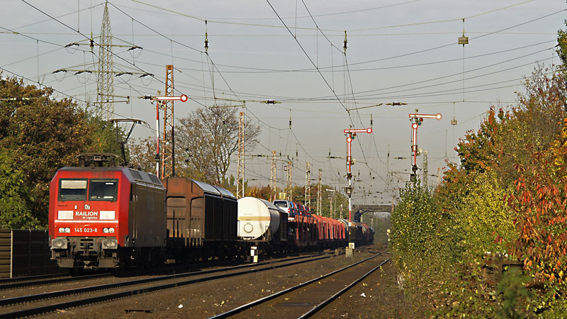 | Die 145 023-8 brachte gerade einen langen "Gemischten" aus dem RBF Seelze heraus, als sie den noch mit Flügelsignalen ausgestatteten Bedarfsbahnhof Ahlem an der GUB passierte. Hannover Ahlem, 20. Oktober 2007 | ||