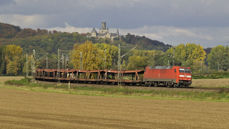 | Die Marienburg bei Burgstemmen! Die 152 141-8 brachte ihren Autotransportzug über die Nord-Süd-Strecke in den Süden elegant durch die lange Kurve. Burgstemmen, 20. Oktober 2007 | ||
