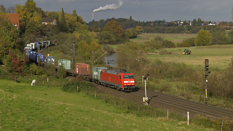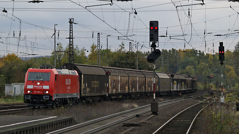 | Mit einem Male brummte der Güterverkehr auf der NSS in der Nordrichtung – dieser schwere Gemischte wurde von der nagelneuen 185 308-4 gezogen. Elze (Han), 20. Oktober 2007 | ||