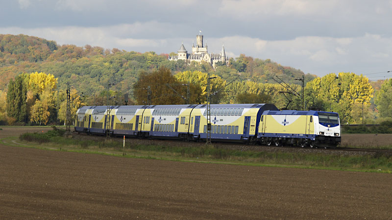 | Wolkenspiele… als der metronom mit der ME 146-17 im Schatten durch die Kurve fuhr – schien die Sonne auf die Burg. Burgstemmen, 20. Oktober 2007 | ||