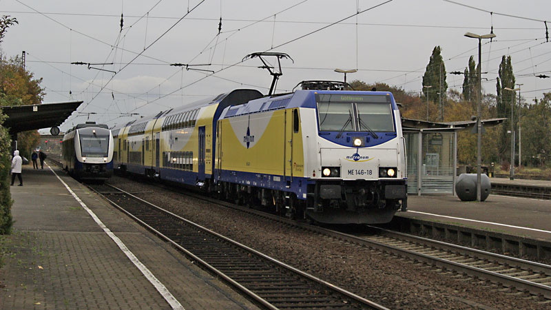 | Dort gibt es stündlich den Treffen zwischen den EuroBahn-Regionalzügen und dem metronom – hier ist der metronom nach Göttingen mit der ME 146-18 eingefahren. Elze (Han), 20. Oktober 2007 | ||