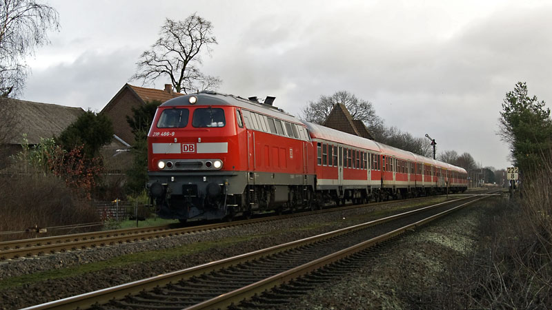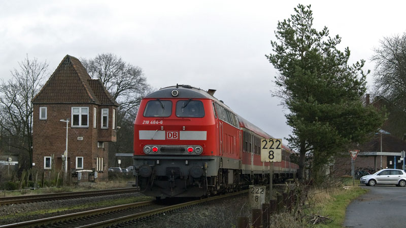 218 464-6 schob diesen RE nach Hamburg in den Bahnhof herein. Himmelpforten, 8. Dezember 2007 |