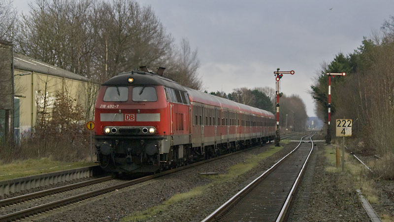 | Diese fotogene Flügelsignalgruppe des östlichen Bahnhofskopfes passierte die 218 492-7 mit ihrem RE nach Cuxhaven. Himmelpforten, 8. Dezember 2007 | ||