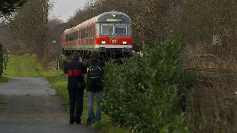 | Auf der Unterelbebahn waren natürlich mehrere Bahnfans unterwegs, so auch diese zwei – die einen herannahenden RE nach Hamburg aufnahmen. Beobachtet werden sie von den beiden Bahnern in ihrem letzten Einsatztag im Steuerwagen… Himmelpforten, 8. Dezember 2007 | ||