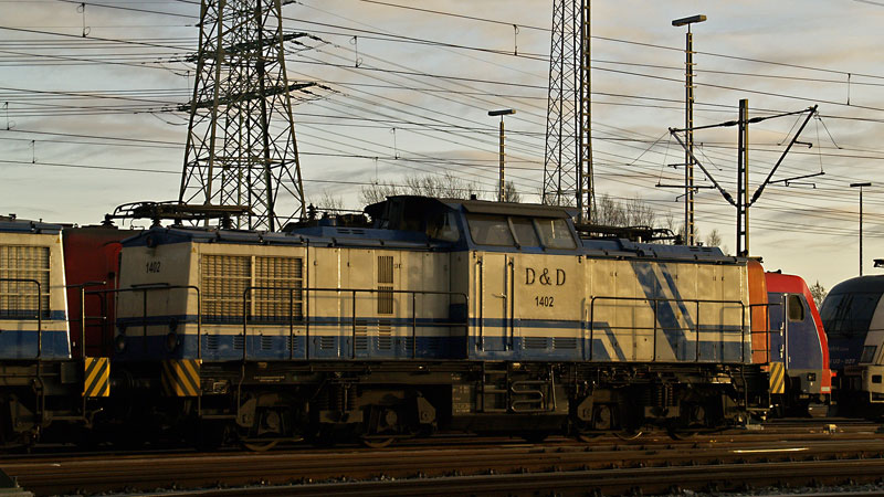 die D&D-Maschinen der guten DR V100 – die Loks 1402 und 1404 (links angeschnitten). Hamburg Waltershof Süd, 13. Januar 2008 |