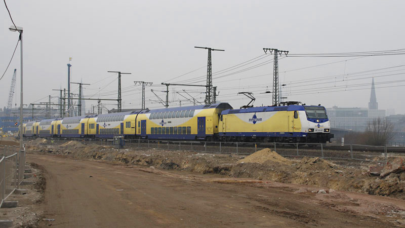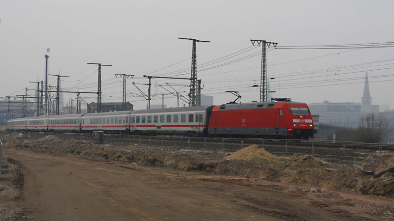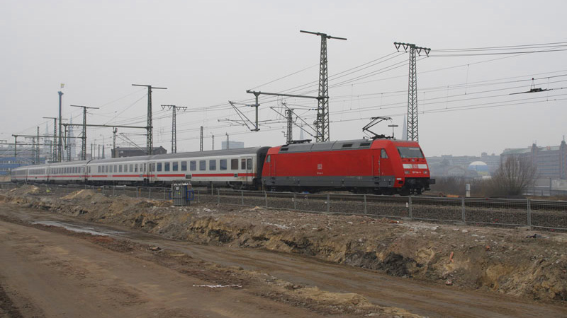 die Großbaustelle HafenCity schob die 101 144-4 ihren InterCity in Richtung