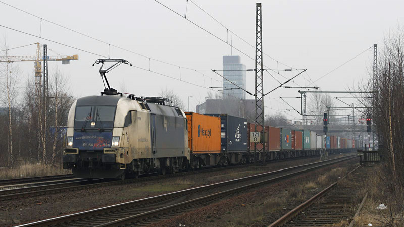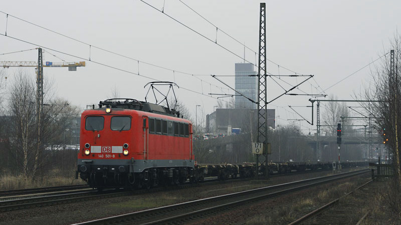 | Fahrbaren Nachschub brachte die 140 501-8 – deren Fahrwerk glänzte richtig frisch – für die Container im Hafen. Hamburg Unterelbe, 21. Februar 2008 | ||