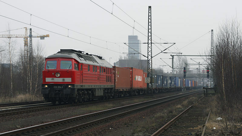 Ludmilla 232 254-3 polterte mit ihrem Containerzug gen Hamburg Waltershof. Hamburg Unterelbe, 21. Februar 2008 |