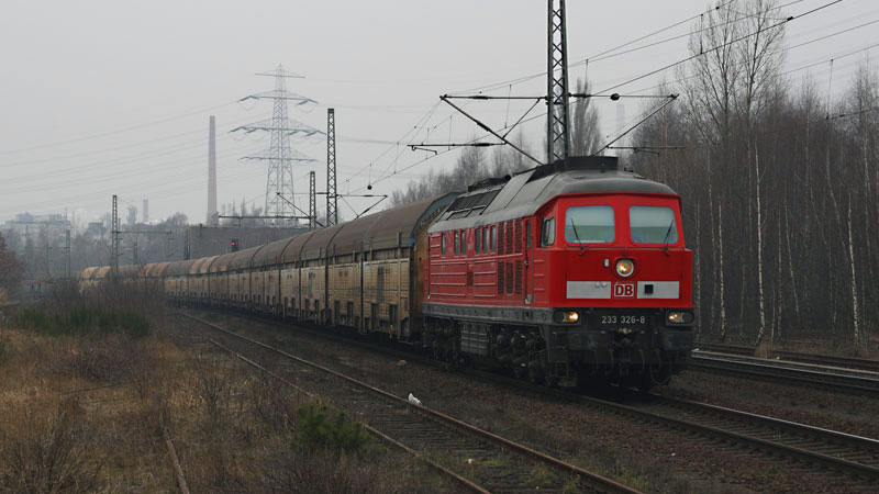 dem CarRail-Logistics-Zug von Cuxhaven röhrte die 233 326-8 gen Maschen. Hamburg Unterelbe, 21. Februar 2008 |
