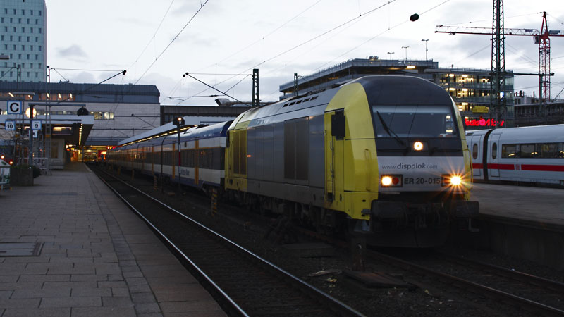 | Die Dispolok ER 20-015 – die mittlerweile erst seit kurzem bei der NOB ist – wartete vor dem Nord-Ostsee-Bahn-Zug nach Westerland auf Ausfahrt. Hamburg Altona, 13. März 2008 | ||