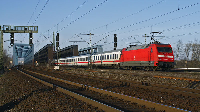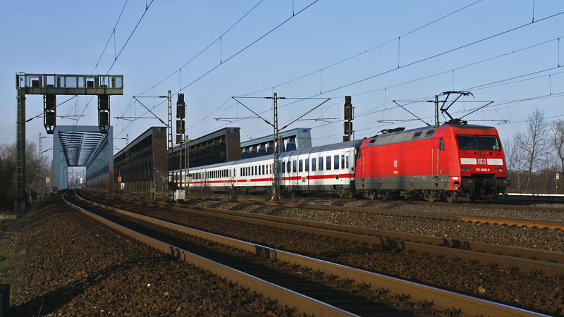 | Die 101 009-9 schob auch ihren IC gen Hamburg Hbf – die 101er verlieren oft ihre Bleche über den Puffern bei Unfällen… Hamburg Süderelbbrücken, 23. März 2008 | ||