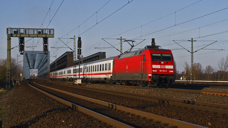der Frühfrühlings-Dämmerung rannte die 101 110-5 mit ihrem IC gen Süden. Hamburg Süderelbbrücken, 23. März 2008 |