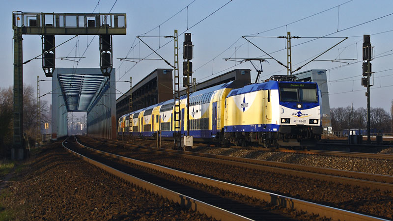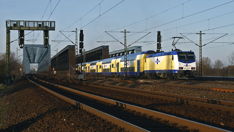 ME 146-01 mit ihrem metronom nach Bremen. Hamburg Süderelbbrücken, 23. März 2008 |