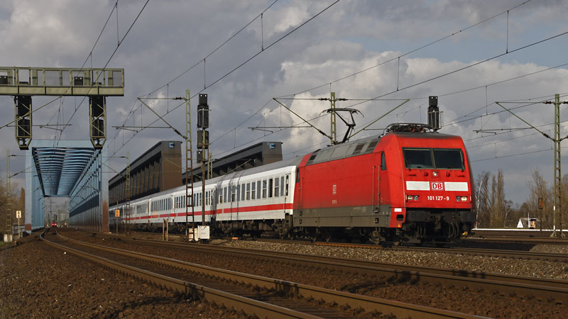 einem InterCity polterte die 101 127-9 westwärts. Hamburg Süderelbbrücken, 29. März 2008 |
