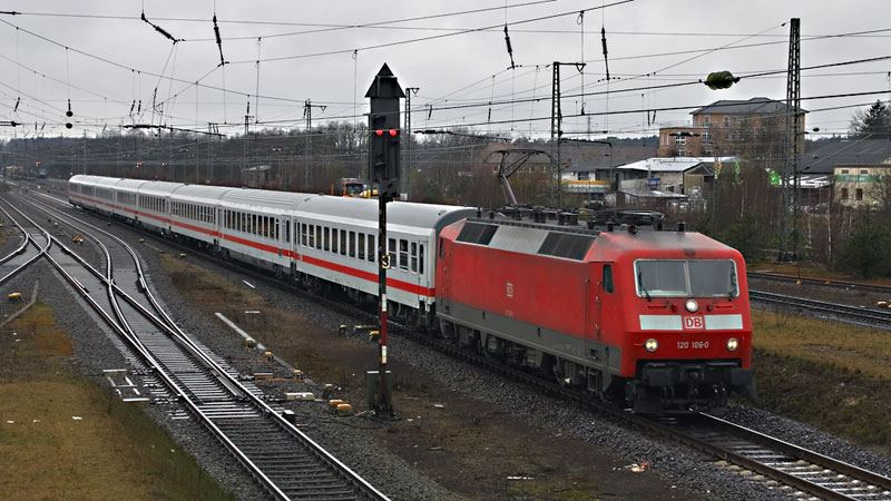einem InterCity rollte die 120 106-0 durch den Bahnhof gen Hamburg. Buchholz (Nordheide), 29. März 2008 |