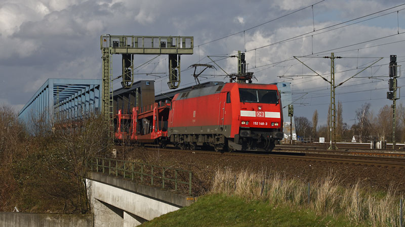 152 148-8 hatte einen langen Leerzug voller Autotransporter am Haken. Hamburg Süderelbbrücken, 29. März 2008 |
