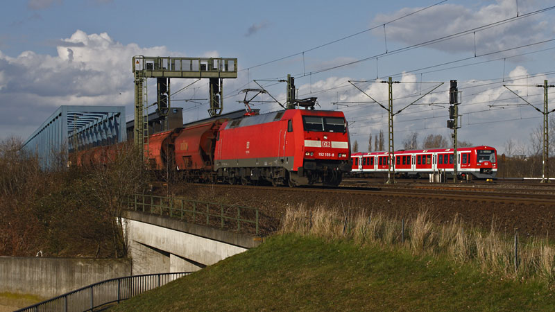 152 155-8 führte einen Wettrennen mit der S-Bahn nach Neugraben. Hamburg Süderelbbrücken, 29. März 2008 |