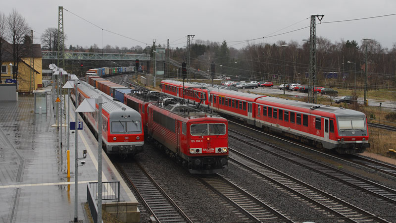 | Die 155 260-3 hatte ihre Schwester 155 264-5 und den Containerzug am Haken, als sie die beiden Heidebahn-Triebwagenzüge passierte. Buchholz (Nordheide), 29. März 2008 | ||