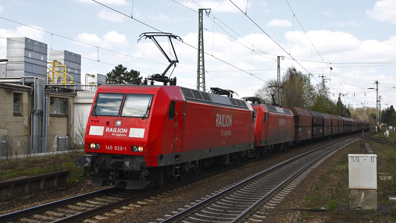 einem Kokspendel donnerten die 145 026-1 und 145 055-0 durch den Bahnhof. Lüneburg, 22. April 2008 |