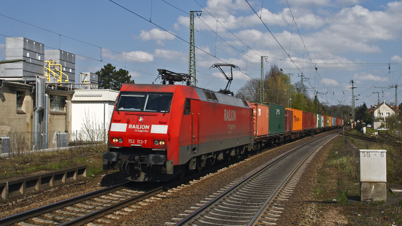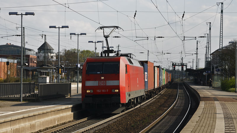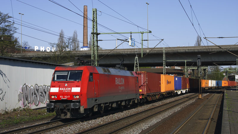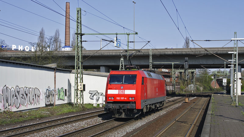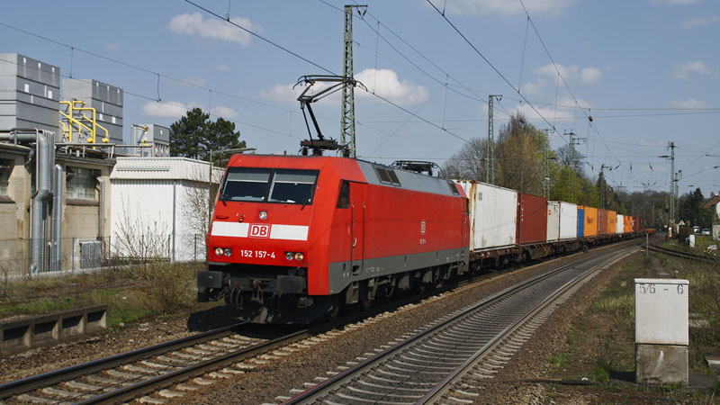 uns schon in Harburg begegnete 152 157-4 mit ihrem Containerzug auf dem