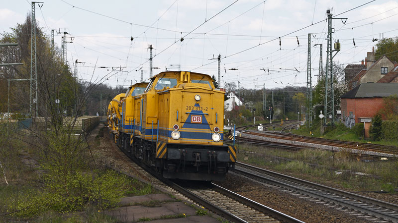 einem Bauzug dieselten die 203 313-2 und 203 307-4 von DB Netz gen Süden. Lüneburg, 22. April 2008 |